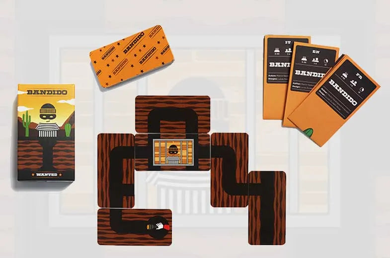 Bandido es un juego cooperativo de estrategia y observación para toda la familia. En su turno, el jugador debe poner una carta que conecte con las cartas ya puestas en la mesa. Todos siguen jugando hasta conseguir bloquear todas las salidas o cuando no queden cartas para robar del mazo. Si los jugadores han logrado bloquear todas las salidas, han ganado el juego. Pero si el túnel sigue abierto Bandido se escapa y ¡han perdido!